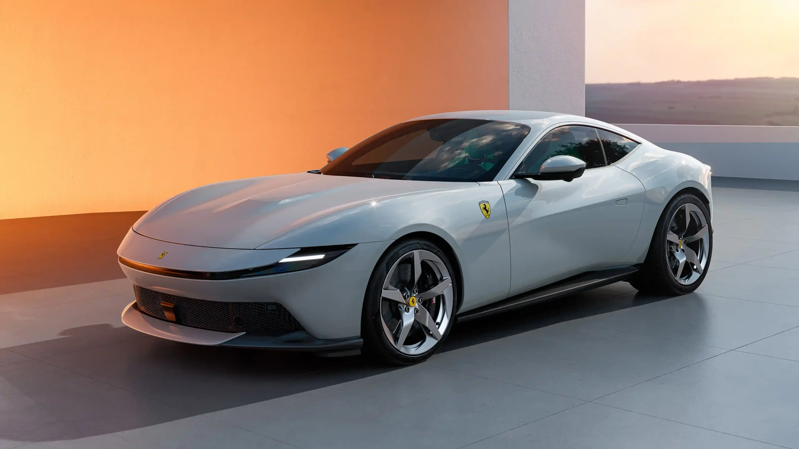 A stunning 4K wallpaper featuring the elegant Ferrari Roma coupe, presented in a sleek, light grey finish. The car’s minimalist yet aggressive lines are perfectly highlighted against the backdrop of a modern terrace, bathed in the soft, warm glow of either sunrise or sunset. The light catches the subtle curves, emphasizing the car’s La Nuova Dolce Vita design philosophy—a blend of timeless elegance and contemporary performance.