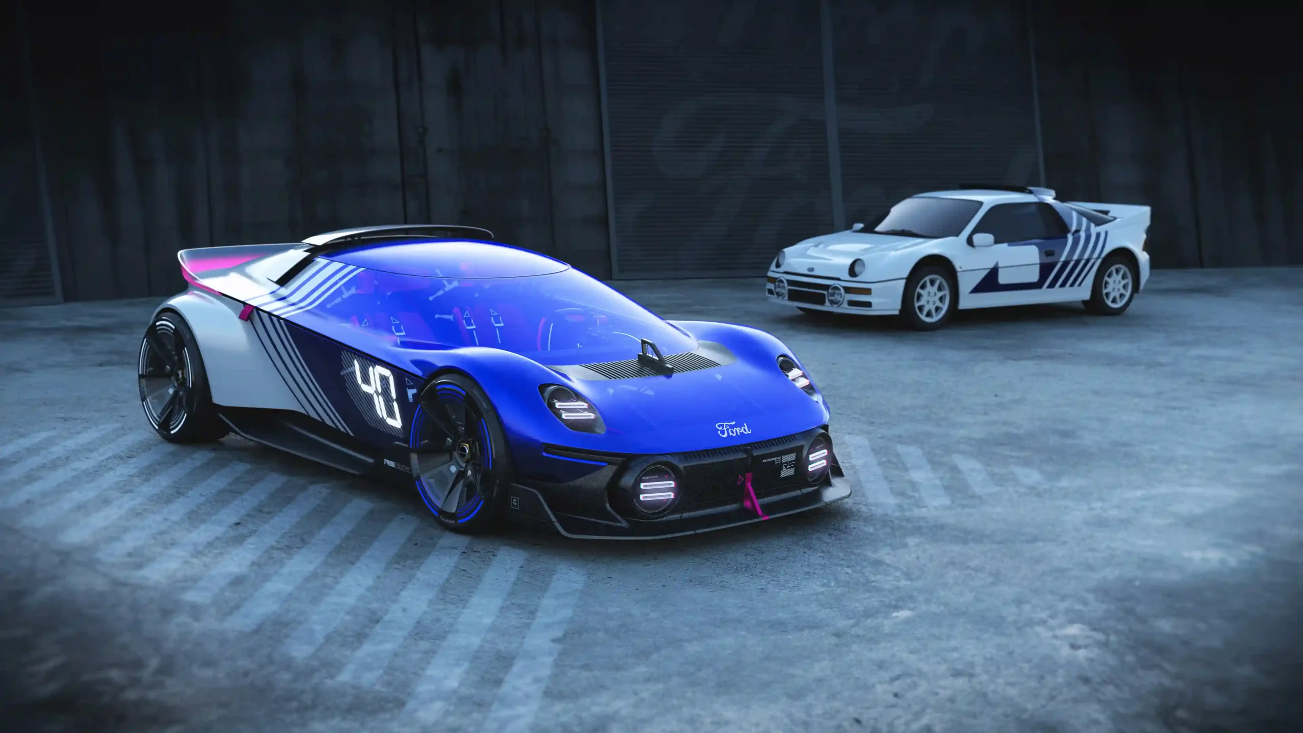 Witness the evolution of a legend with this electrifying 4K wallpaper featuring the Ford RS2.00 Concept. Set in a gritty, industrial hangar, the vehicle is a striking blend of heritage and hyper-futurism. Its aerodynamic body is drenched in a vibrant, “Electric Blue” and stark white livery, accented by glowing cyan light strips and a transparent blue canopy that reveals a high-tech racing cockpit. In the background, the original white Ford RS200 stands as a silent sentinel, bridging the gap between rally history and its digital successor.