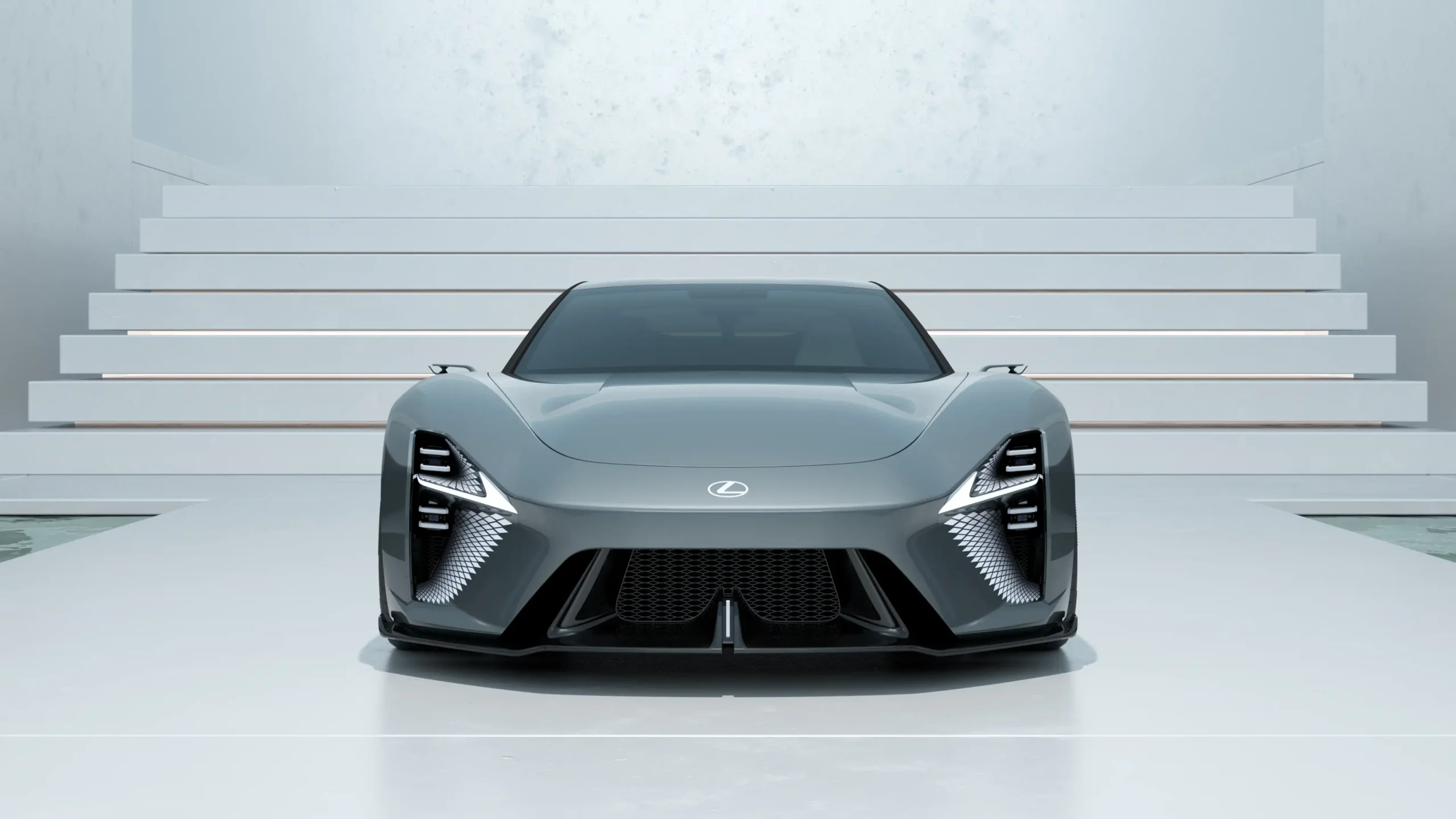 Drive into the future of automotive design with this pristine 4K wallpaper. Featuring the Lexus Electrified Sport concept, the vehicle is captured in a clinical, ultra-modern sanctuary of white stone and architectural symmetry. The car’s slate-gray aerodynamic curves and intricate, glowing LED headlamps command the center of the frame, reflected perfectly on the polished gallery floor. Every line suggests a silent, electric velocity, framed by a monumental staircase that leads toward a horizon of pure light.